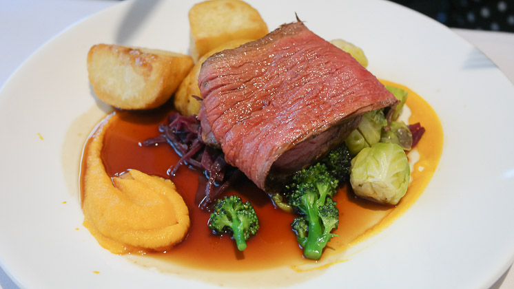 Tucking in – the roast beef was delicious, and cooked pink. The roast potatoes were perfect – very crispy on the outside, fluffy in the middle. The Yorkshire was great, with a nice doughy inside. The vegetables were good – and superb cauliflower cheese.